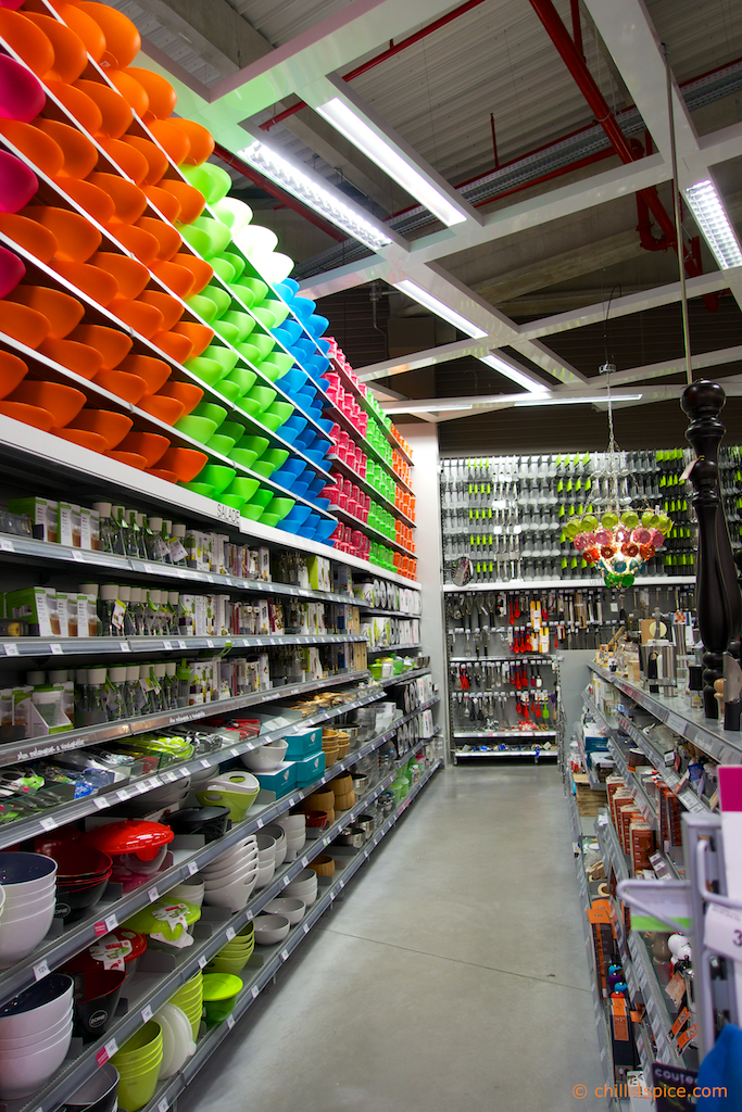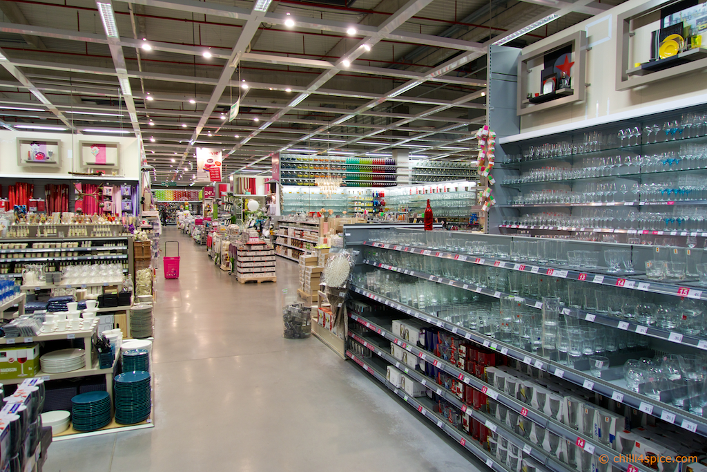 Stellt Euch vor, ein Geschäft so riesig wie mehrere Fußballfelder (zumindestens gefühlt) und drinnen voll mit Dingen von denen Ikea und Interio zusammen nur träumen können. Egal wohin man(n) schaut nur Farben und Formen, dazu die typische Berieselungsmusik und ein merkwürdiger Geruch aus einer Mischung von Plastik, Metall, Räucherstäbchen, Duftkerzen und Weichspüler. Ich wollte in der Sekunde nur raus – doch zu spät – das weibliche Interesse war geweckt …